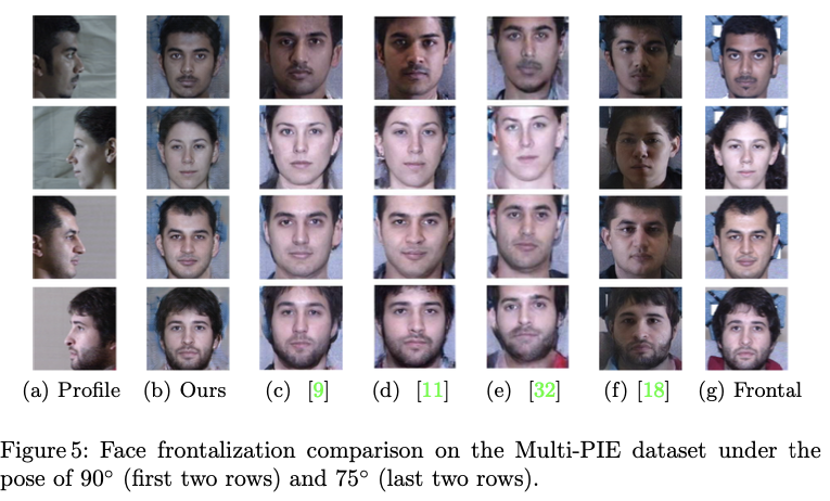 实验结果表明,本文的方法不仅能够生成较为逼真的正面人脸,同时也可以解决大角度的人脸识别问题。