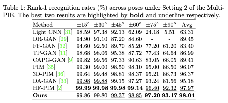 为了体现人脸正向化模型对人脸识别性能的提升以及本文方法的优越性,作者将本文方法作为人脸识别的一个预处理过程,首先对所有侧脸执行正向化操作,其后将生成正脸图像输入到LightCNN中计算得到特征向量,使用余弦距离作为相似性度量计算得到Rank-1识别准确率,可以看到本文方法在大于75度的极端角度情况下可以达到SOTA效果。