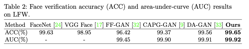 为了展示本文方法在受限场景和非受限场景中都可以得到很好的效果,作者在LFW数据集上计算了ACC和AUC指标,都达到了SOTA效果。