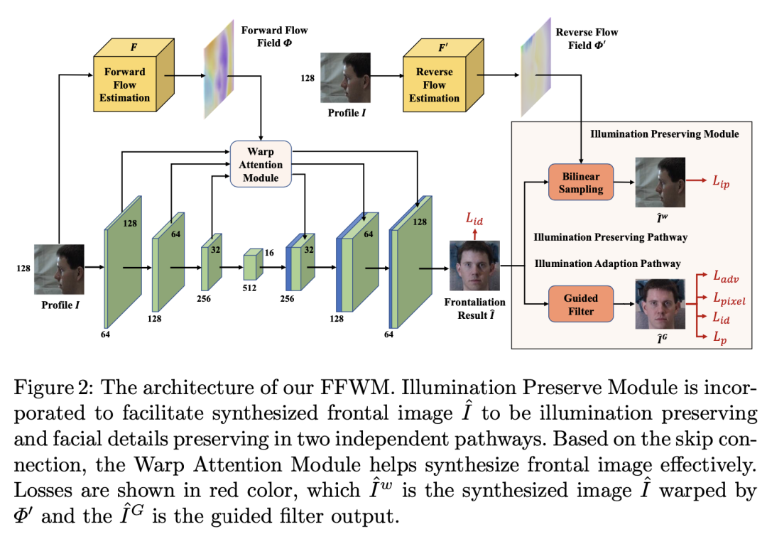 引入了一个光照保留损失,实现了图像中光照信息和人脸身份信息的特征解藕,同时使用光流估计在特征层面得到了侧脸-正脸之间的特征对应关系,