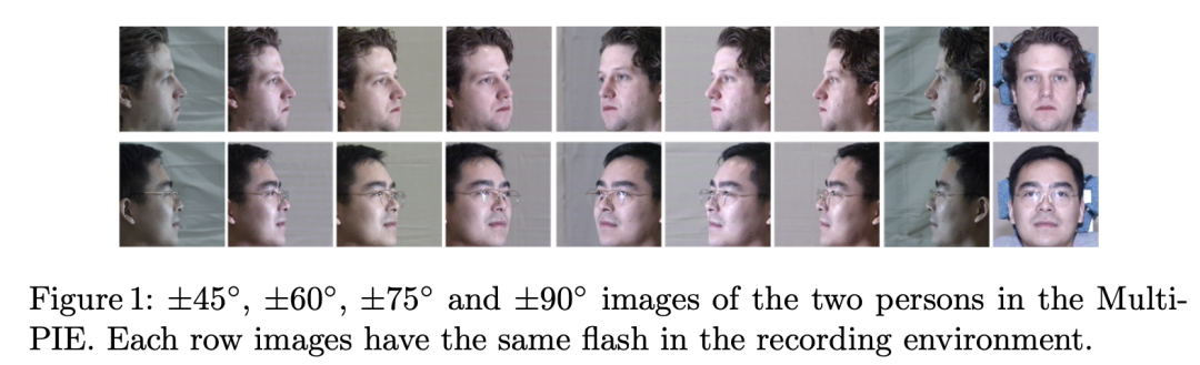 目前针对人脸正向化问题,较为流行的方法是通过大量的侧脸-正脸图像对(profile-frontal pairs)训练一个GAN网络,但是此类方法都忽略了侧脸-正脸之间存在光照不一致的现象,光照不一致主要是由拍摄角度(拍摄现场使用固定的照明设备)造成的,尤其是侧脸角度达到±90°时,光照的明暗差异非常明显,下图为Multi-PIE数据集中不同角度的人脸。