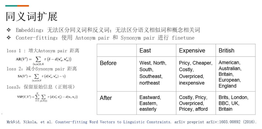 Word2vec 这一类的 embedding 计算方法,核心假设是拥有相似上下文的词相似。需要注意该方法无法区分同义词和反义词/同位词,例如最大/最小,苹果/香蕉。我们这里利用监督学习的信号,对训练完成的词向量空间进行微调。