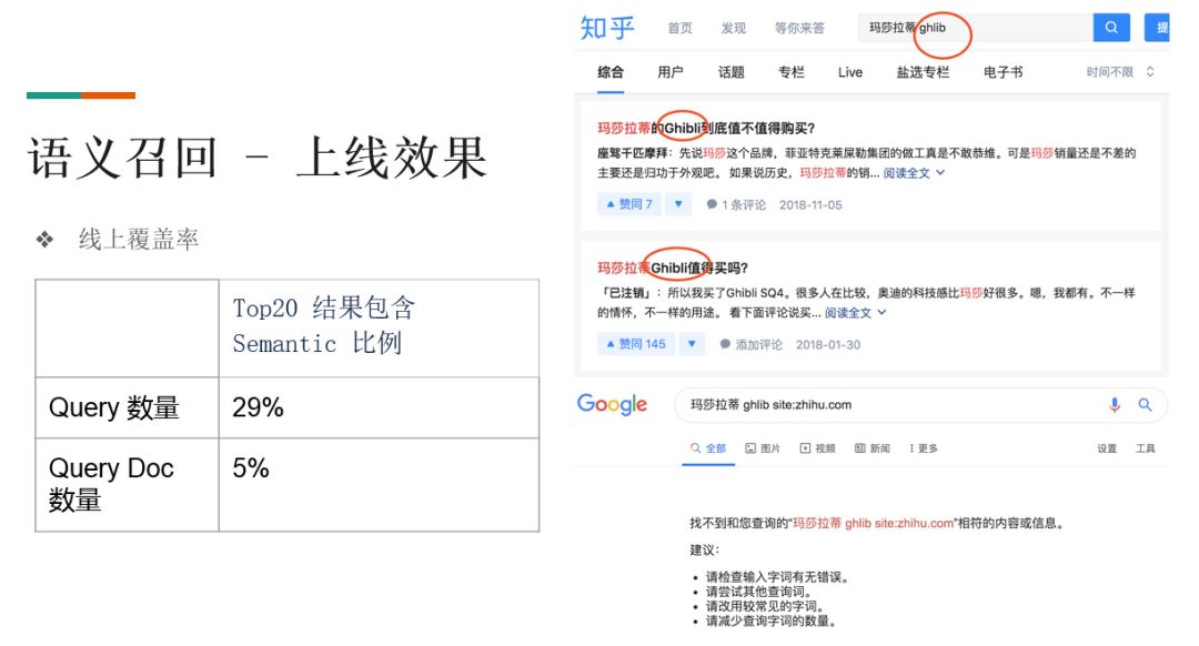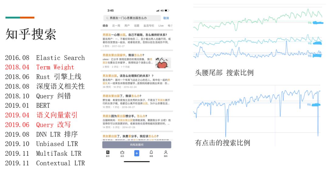 从我们内部实际数据来看,近一年知乎搜索的长尾化趋势也越来越明显。如上图右上部分是头腰尾部搜索比例,可以看到长尾 query 增长趋势明显。但在我们搜索团队的努力下,用户的搜索满意度并没有随着 query 难度的增加而下降。