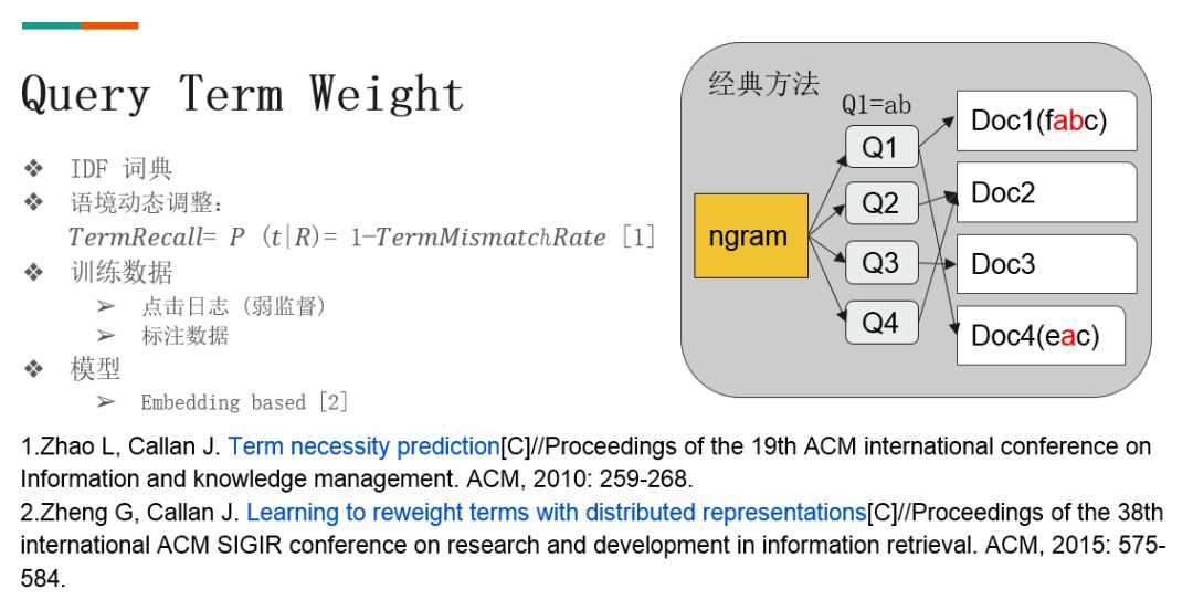 这个方法的局限是无法根据 query 上下文语境动态适应,因为其在不同的上下文中 weight 是一致的。所以我们再通过统计点击数据中进行调整。如图,如果用户的 query 包含 a,b 两个 term,并且点击了 Doc1 和 Doc4,其中 Doc1 包含 a,b, Doc4 只包含a,即 a 出现2次,b 出现1次。一个朴素的想法就是 a 的权重就是1,b 是0.5,这样就可以从历史日志里把每个 query 里的 term 权重统计出来。