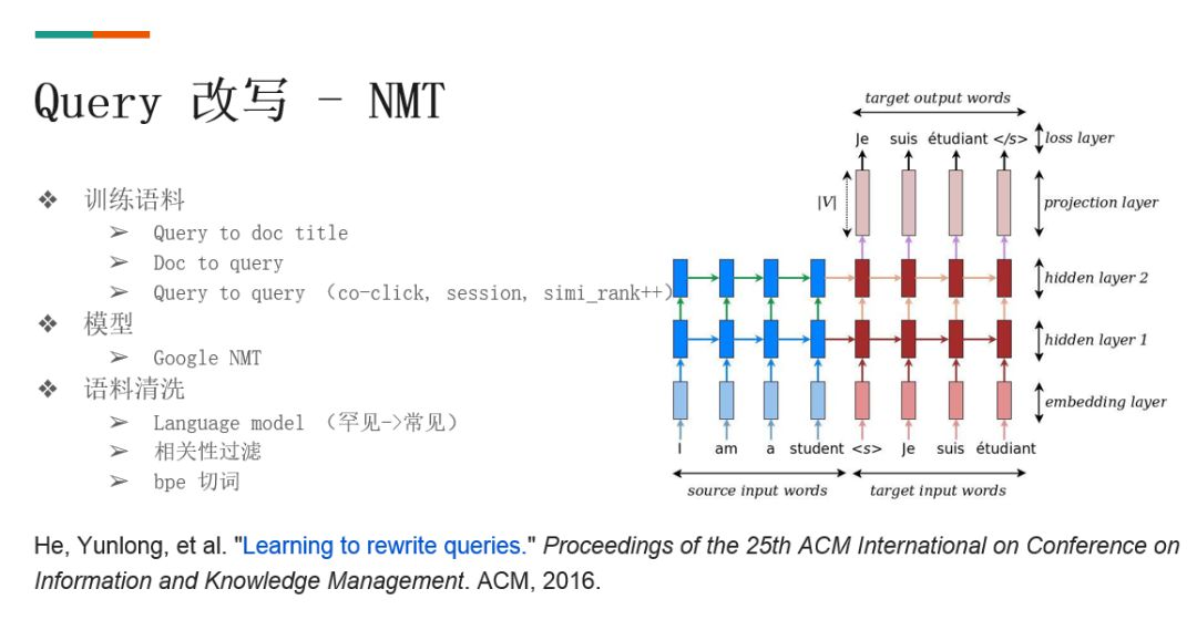 用翻译方法可以实现这个需求,即把改写问题看成 src 和 target 语言为同一种语言的翻译问题,翻译模型用的是谷歌的 NMT 结构。
