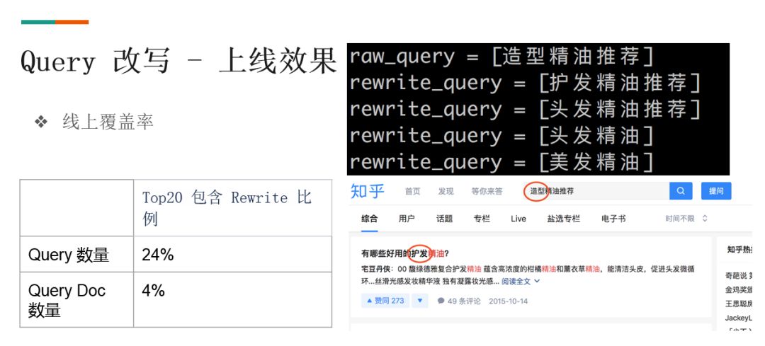 同时,这个价值网络还可以用于在线改写触发 rerank。如下图所示,线上覆盖率有了明显提升, top20 包含 rewrite 比例的 query 数量占到了24%,query doc 数量占到了4%。