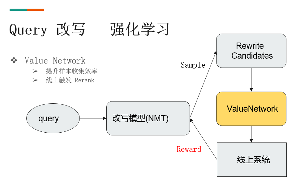 首先会把原始 query 的召回结果和改写 query 的召回结果一并送入排序服务模块,然后得到 topK 的排序;之后统计这 topK 结果里有多少是改写 query 召回队列里的结果,将其作为 reward。