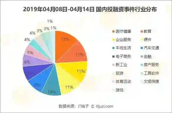 从行业分布来看,医疗健康行业成为上周发生投融资事件最多的行业,出现 10 起,占比13%;其次,教育、企业服务、硬件行业并列第二,发生 9 起投融资事件,占比 11%;本地生活行业位列第五,发生 8 起投融资并购事件,占比 10%。