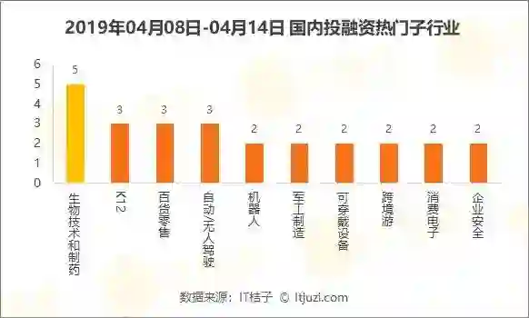 上周最受投资人追捧的子行业依次是生物技术和制药、K12、百货零售、自动/无人驾驶、机器人、军工制造、可穿戴设备、跨境游、消费电子、企业安全。