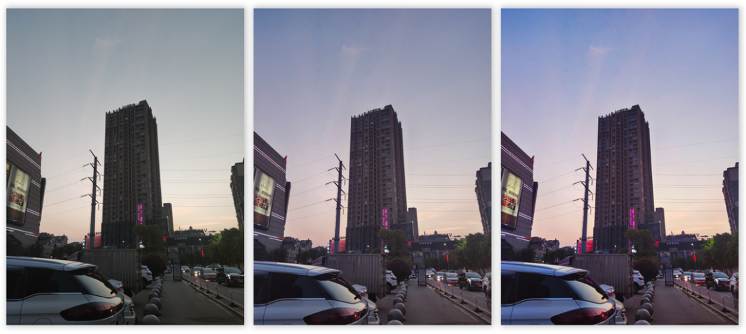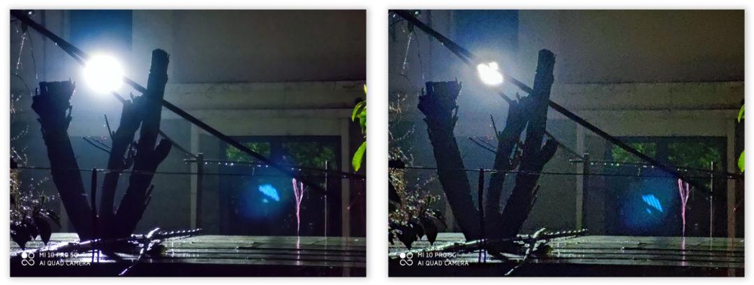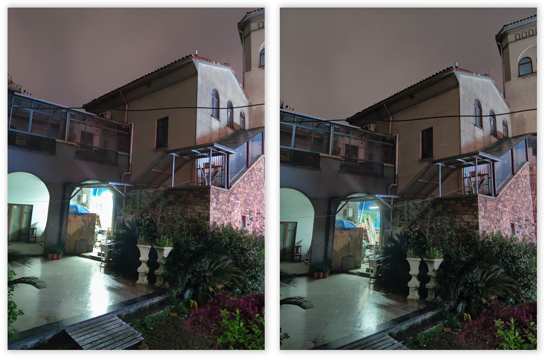 「请持稳手机」顶多算半个夜景模式,这个真夜景模式才是动真格的。可以看到,左边的「请持稳手机」把照片拍亮了,右边的「全自动」夜景模式把亮的拍到了。