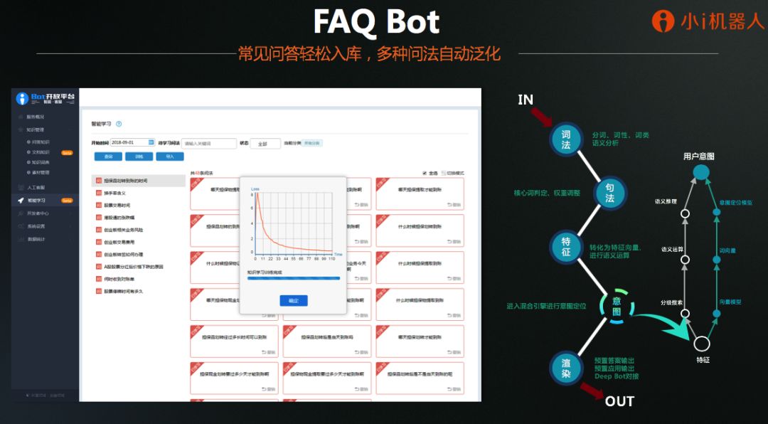 FAQ Bot 提供了常见问答的精准语义理解和多种问句的自动泛化能力,通过深度结合自学习的自动化模型 + 人工表达式的方式,读懂用户同一个意图的多种问法,在专业领域范围内实现语义理解和准确回答。其中,针对问句自动泛化能力,小 i 主要存在三种类型的泛化:第一、模型自身的泛化能力;第二、知识库的语义泛化能力;第三、通过问句生成算法显式推荐并人工确认的泛化能力。