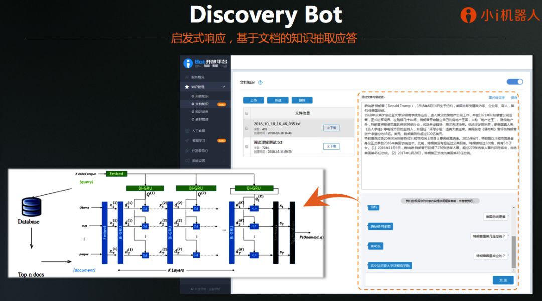 Discovery Bot 是指对用户问题的启发式响应回答能力。对于用户问题如果 FAQ Bot 和 Deep Bot 无法提供匹配的答案,则进入启发式响应回答环节。启发式响应环节的数据来源广泛,包括非结构化的文档,内部积累的数据,用户历史日志,外部抓取数据等等,基于非结构化数据获取多个答案候选,排序后如果置信度较高则直接返回给用户,置信度低的答案会结合人工审核或者直接人工介入回答,同时该问答也会进入知识库,进一步累积数据。