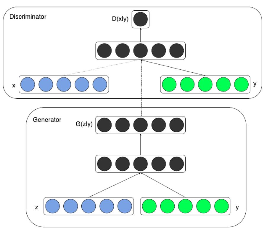 其中,y 是加入的监督信息,D(x|y) 表示在 y 的条件下判定真实数据 x,D(G(z|y)) 表示在 y 的条件下判定生成数据 G(z|y)。例如,MNIST 数据集可根据数字 label 信息,生成相应标签的图片;人脸生成数据集,可根据性别、是否微笑、年龄等信息,生成相应的人脸图片。CGAN 的架构如下图所示: