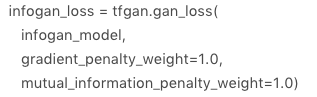 # 通过 tfgan.gan_loss,生成 infogan 模型的 loss 值: