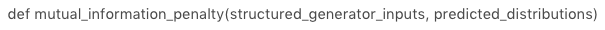 # InfoGan 的 Loss 值为在 GAN 的 loss 值上,加上互信息 I(c;G(z,c)),TFGAN 中提供了互信息计算的 API,如下所示。其中 structured_generator_inputs 为潜变量的噪音信息,predicted_distributions 为变分分布 Q(c|x)。