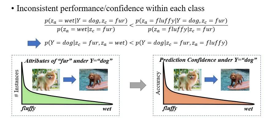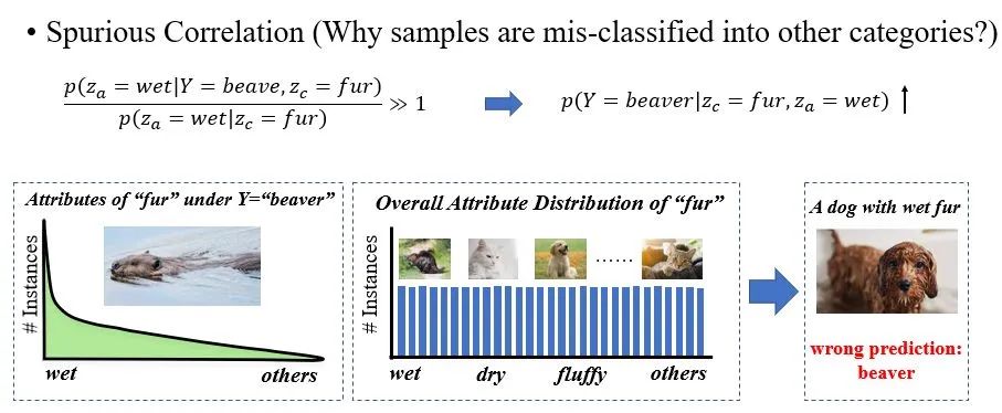 的取值不同 attribute bias 项会使同一类的样本出现难易之分(如潮湿的皮毛在狗的类别内特别罕见则会使得潮湿的狗变为困难样本),即图 4 的例子。其次,属性偏见(attribute bias)还能解释类别之间是如何产生错分的。比如潮湿的皮毛在河狸类中就很常见,因为河狸大多生活在水里,这就给“潮湿的皮毛”与“河狸”之间产生了伪相关性。让潮湿的狗有很大概率被错分为河狸,也就是图 5 的例子。