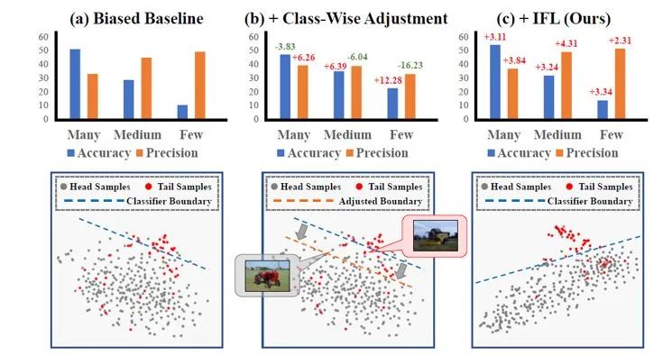 ,除了传统的正确率(accuracy)外我们也引入了准确率(precision),从而更好的分析传统长尾分类算法的 Accuracy-Precision Trade-off [6] 现象。