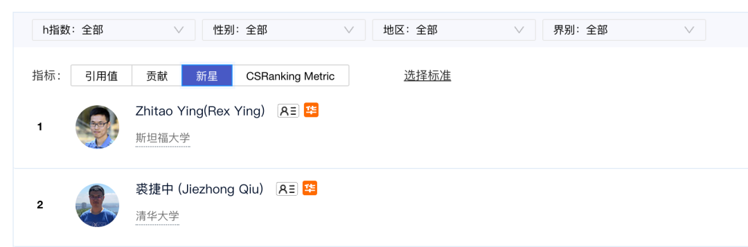 根据AMiner AI2000 数据,Rex Ying 和裘捷中是2018年-2022年间,AI 2000 数据挖掘领域新星和贡献值的第一名和第二名。