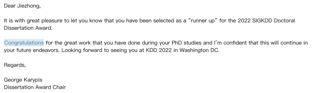 KDD2022博士论文奖,来自斯坦福大学的Rex Ying(应智韬)获得博士论文奖WINNER奖,清华大学裘捷中获得Runner Up 奖 。