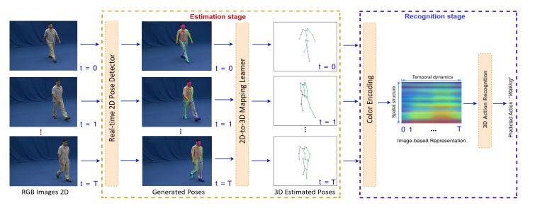 最近,研究人员提出了一种基于深度学习的多任务模型,用于基于RGB视频序列的关节三维人体姿态估计和动作识别。这种方法分为两个阶段。首先,研究人员设计并训练了一个实时二维姿态探测器来确定人体重要关键点的精确像素位置,并设计了一个双流神经网络来将检测到的二维关键点映射成三维姿态。