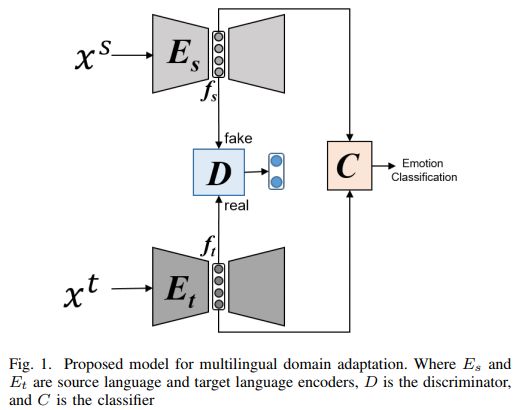 研究人员提出了一种基于生成对抗网络的多语言SER模型。该算法具有学习语言不变表示的能力。该模型对源语言数据和目标语言数据使用特征编码网络,并使用鉴别器模型强制源编码模型学习类似于目标语言的表示;以及用于情绪识别的分类器。