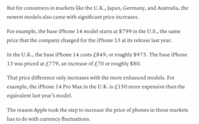 例如,iPhone 14 在美国的起售价为 799 美元,与 iPhone 13 价格相同。而在英国,iPhone 14 起售价为 849 英镑(975 美元),比 iPhone 13 发布时起售价上涨约 90 美元。