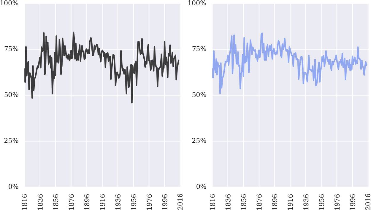 图 1:案件和司法判决准确度(1816-2015)