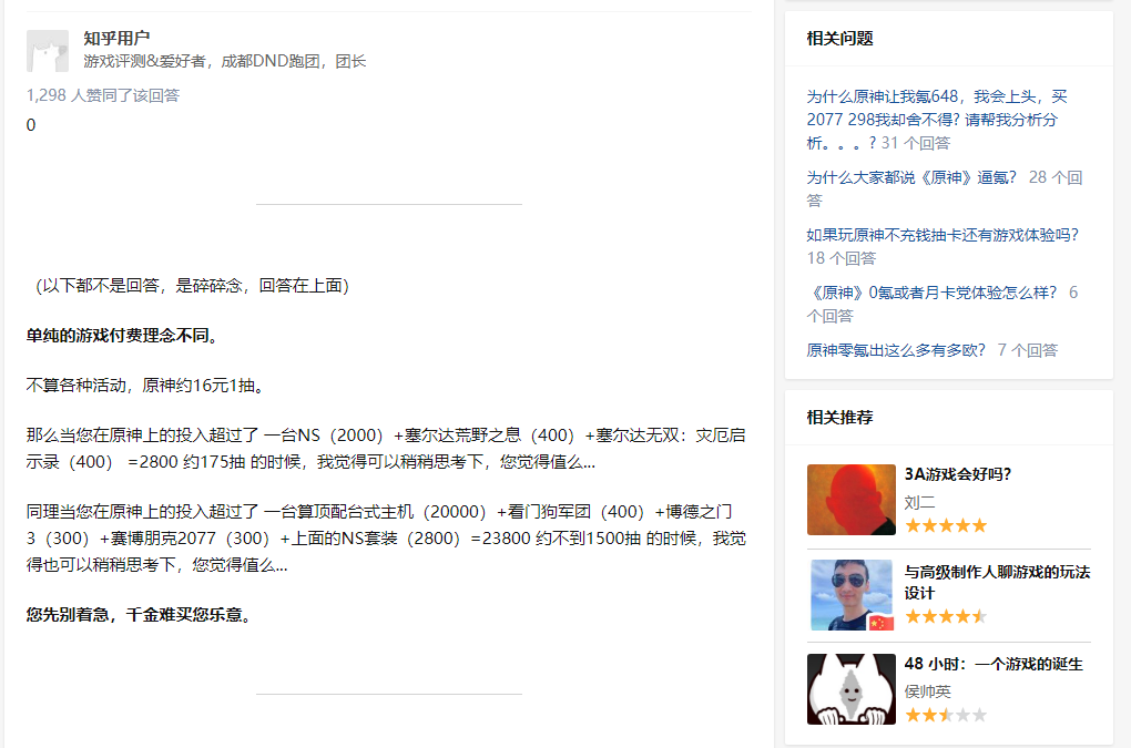 就像在知乎“你能接受给《原神》氪多少钱?”话题下,有玩家给原神算过帐,不算活动,《原神》约16元1抽, 而该答主将玩家们日常抽卡的标准换算成了游戏主机和3A大作,比如一台NS(2000)+塞尔达荒野之息(400)+塞尔达无双:灾厄启示录(400) =2800 约175抽,175抽只能抽出《原神》的一个保底五星角色。