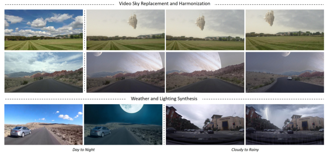 研究人员将这个艺术加工过程分解成 3 个任务:天空抠图(sky matting)、运动估计和图像融合,并在智能手机和行车记录仪在户外采集到的视频上进行了实验,结果表明该方法在视觉质量以及光照、动态方面均具有高保真度和不错的泛化性。