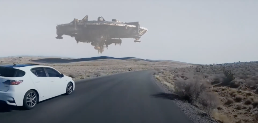 荒野、公路、疾驰的汽车,还有天边的巨型神秘建筑物,有科幻 / 末世电影内味儿了。然而,这幅场景竟然是从晴空万里的画面转换而成的。公路片变身科幻片?!