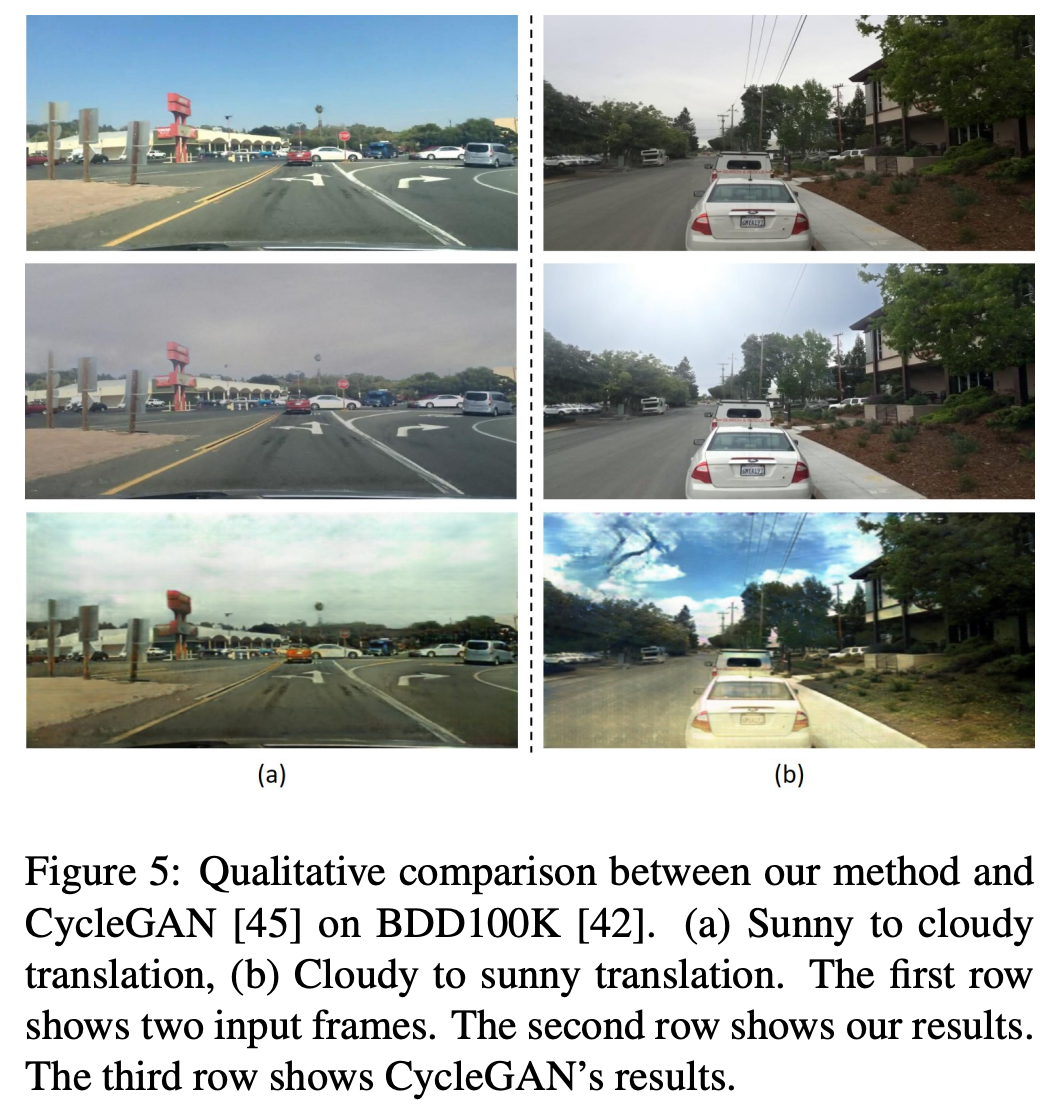 下表 2 给出了在不同天气转换场景下这两种方法的图像保真度定量对比结果。该研究提出的方法在两个定量度量指标和视觉质量上均显著优于 CycleGAN。