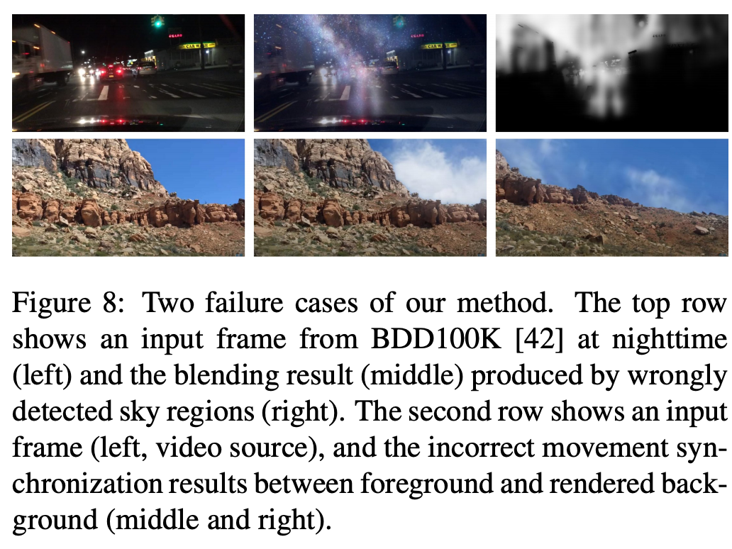 首先,天空抠图网络仅基于白天的图像训练,因此该方法可能无法检测夜晚视频中的天空区域。