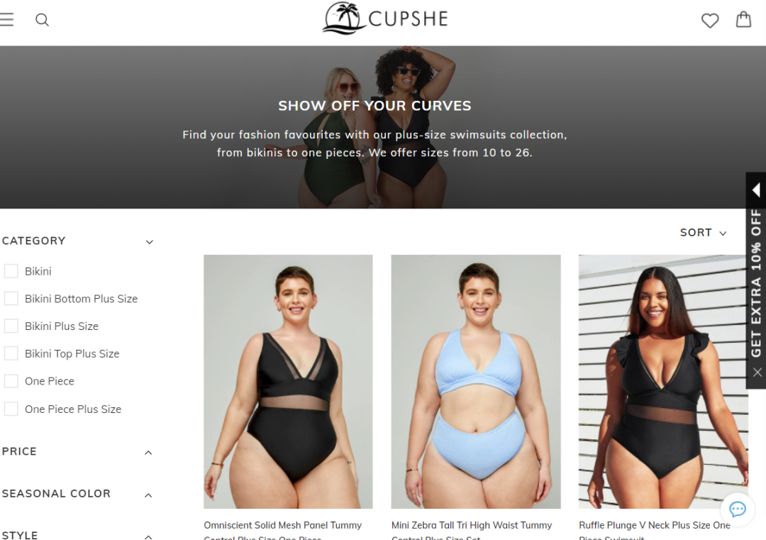 Cupshe的泳装尺码包括XS到XXL,此外还单独开设了大码泳装分类,由大码模特们自信展示试穿效果。