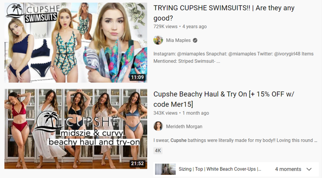 而泳装类内容,天然更易获得消费者的分享和点赞。Youtube平台上,有关Cupshe的测评视频不一而足。服饰穿搭博主们上传的各类内容,往往以多张泳装试穿图作为封面,非常吸睛。