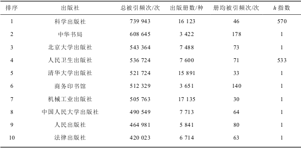 注:①因有10个出版社的出版册数及册均被引频次数据缺失,表中以“—”表示,只显示总被引频次指与h指数;②计算册均被引频次指标时四舍五入取整数。