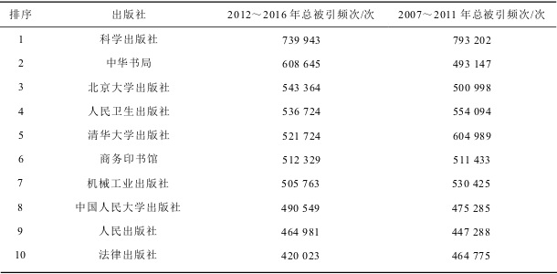 本文摘编自《中国出版社学术影响力研究》(任全娥 等著 . 北京: 科学出版社, 2019.1)一书“ 第五章 出版社学术影响力实证分析(2012~2016年)”,有较大删减。