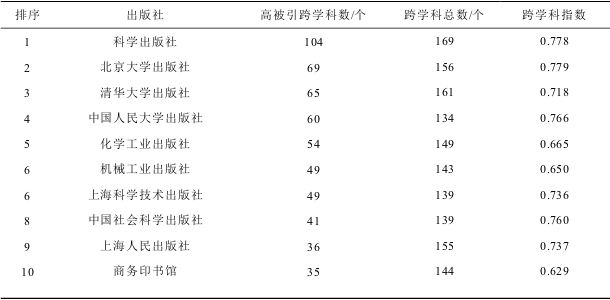 而且,在高被引跨学科出版社中,有21家出版社在至少21个学科被引中位居前10名(即高被引跨学科数至少为21),这些高被引跨学科出版社,既包括科技类综合性出版社和大学出版社,也包括社会科学领域的老牌知名出版社如中国社会科学出版社、商务印书馆与社会科学文献出版社等。