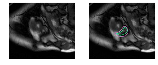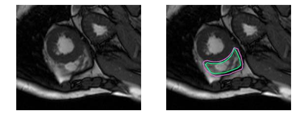 撇开医学术语不谈,要识别RV就更困难了。左心室是一个厚壁圆环,而右心室是一个形状不规则的物体,有薄的壁,有时会与周围的组织混合在一起。这是MRI快照右心室内壁和外壁(心内膜和心外膜)的手工绘制轮廓: