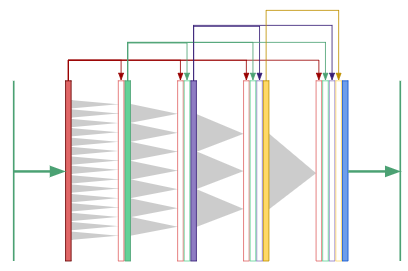 从原理上来说,黄色标记的卷积层被u-net中的扩张卷积所替代。最内层的神经元现在具有了覆盖整个输入图像的感受野。我称之为“扩张u-net”。