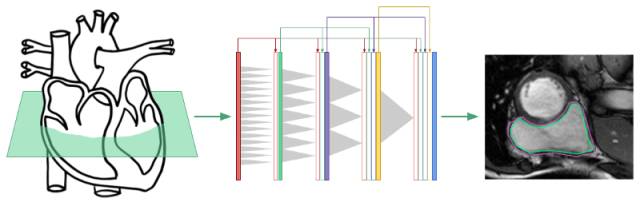 开发一个能够对心脏磁共振成像(MRI)数据集图像中的右心室自动分割的系统。到目前为止,这主要是通过经典的图像处理方法来处理的。而现代深度学习技术有可能提供更可靠、更自动化的解决方案。