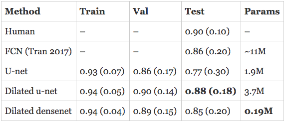 扩张u-net与心内膜上的最新技术水平相当,并超过它在心外膜上的表现。扩张DenseNet紧跟其后,仅有190K个参数。