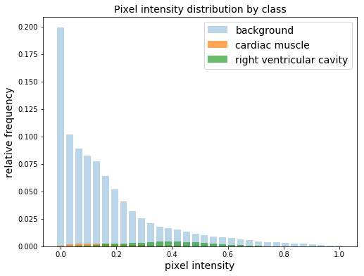 由于大多数像素都属于背景,所以各个种类之间分布不平衡。如果将像素强度归一化在0和1之间,那么在整个数据集中,只有5%的像素属于RV腔的一部分。