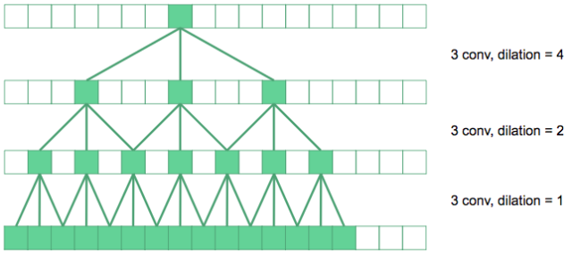 在上图中,底层的卷积是规则的3×3卷积。下一层,我们将卷积扩大了2倍,所以在原始图像中它们的有效感受野是7×7。如果顶层卷积扩大4倍,则能产生15×15的感受野。以此类推。