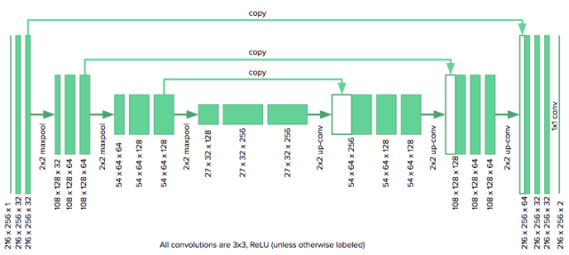 由于我们图像尺寸是u-net作者原本考虑的一半大小,所以我们需要将原始模型中的降采样层数从4个减少到3个来适应网格。我们也要用零来填充卷积,以保持图像的大小不变。该模型是用Keras实现的。