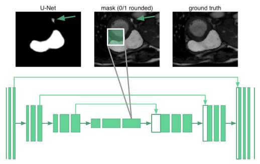 要对器官图像进行分割,需要了解器官之间排列的相关知识。事实证明,即使在u-net最深层的神经元也只有68×68像素的感受野。网络的任何部分都无法“看到”整个图像。网络不知道人类只有一个右心室。例如,下面的图片中,箭头标记的地方被错误分类了: