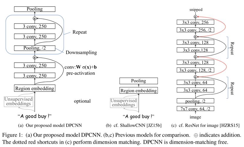 首先丢上(a)DPCNN与(b)TextCNN(文中称为ShallowCNN)、(c)ResNet的对比图,如图2。