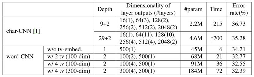 在no-free-lunch衍伸出的公平比较问题上,[3]是一篇做的不错的文章。其通过多维度比较word-level的精心设计的TextCNN模型与char-level的精心设计的VDCNN模型,从而相对谨慎的得出char-level的模型确实没有word-level模型高效的结论。表1是测试集性能比较。