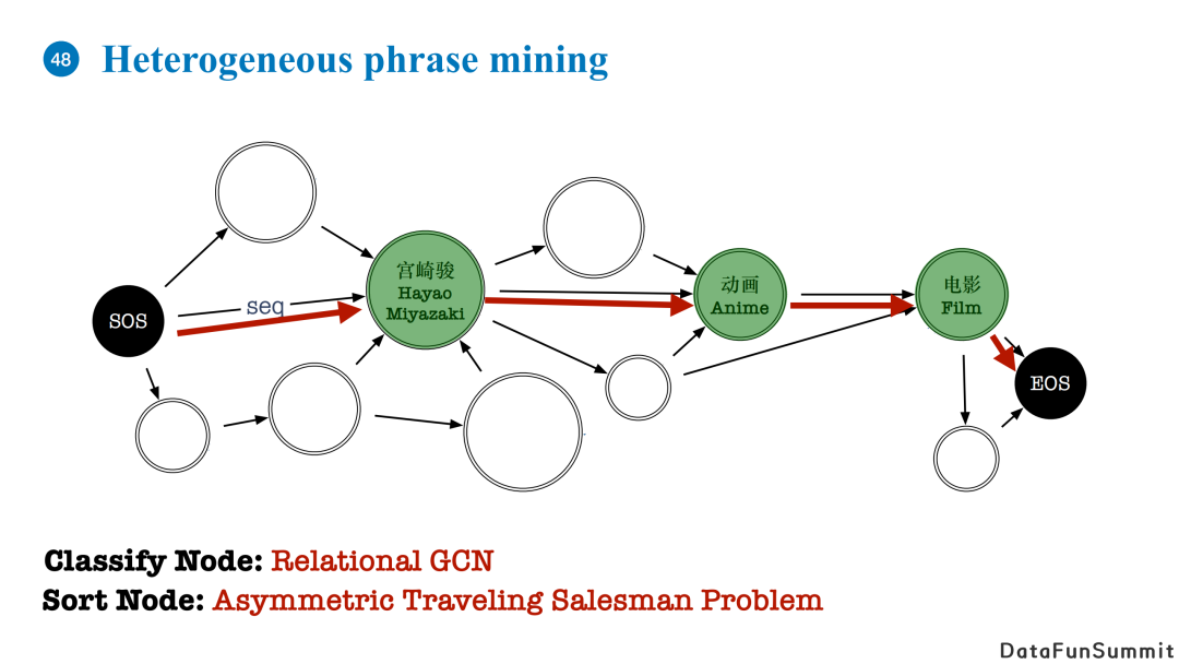 第二,我们需要对抽取的词语做排列,形成一个短语而不是词的集合,我们将其转化为非对称最短旅行商问题,即我们需要从SOS出发EOS结束的路线中找到一条长度最短且经过所有被Relational GCN分类为正的路线。这个问题有现成的算法可以直接使用。