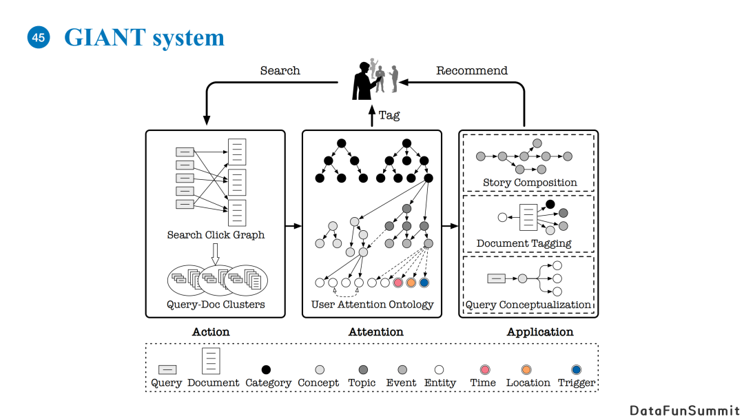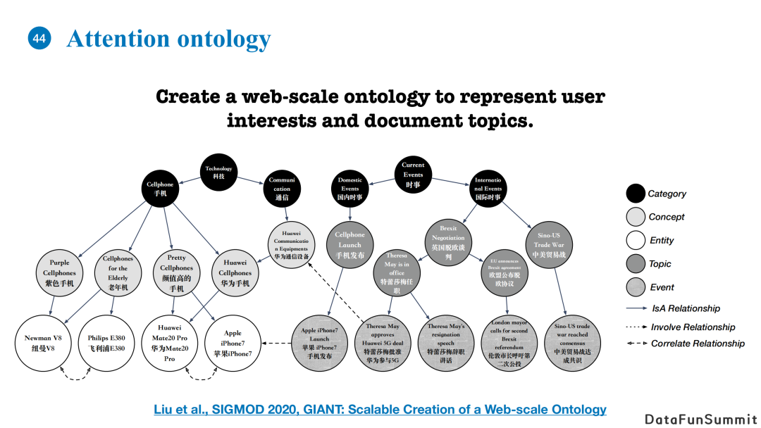 我们发表在SIGMOD 2020的工作主要是建立了一个本体,其利用大量的用户query和相应的点击文章去抽取不同用户的信息点,包括不同的话题短语、事件短语、概念短语、实体,以及人工定义的高层次类目(如科技、时事、手机等)。上图黑色的节点代表着category,即人工定义的类目,灰色节点代表挖掘的概念、事件、话题等,比如颜值高的手机、辞职演讲、欧盟公布脱欧协议等,还有各种实体(如各类手机等)。其中本体图中最主要的关系是上下位关系,它代表着节点之间的从属关系。