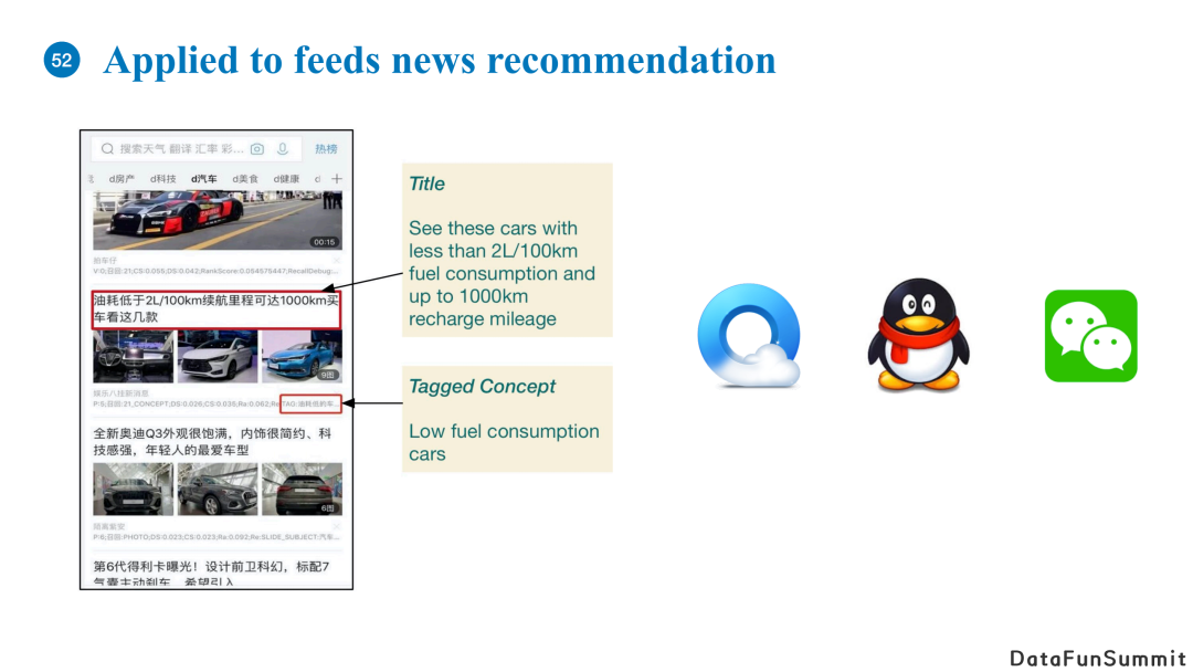 这里举个例子。比如上图左侧的文章,我们可以对它打一个tag叫做“油耗低的汽车”。这种tag一般在标题甚至内容里可以不出现,但是我们的系统可以判断出这篇文章是在讲述这一主题。这种功能可以应用在QQ浏览器、手机QQ、微信等新闻信息流推送中。